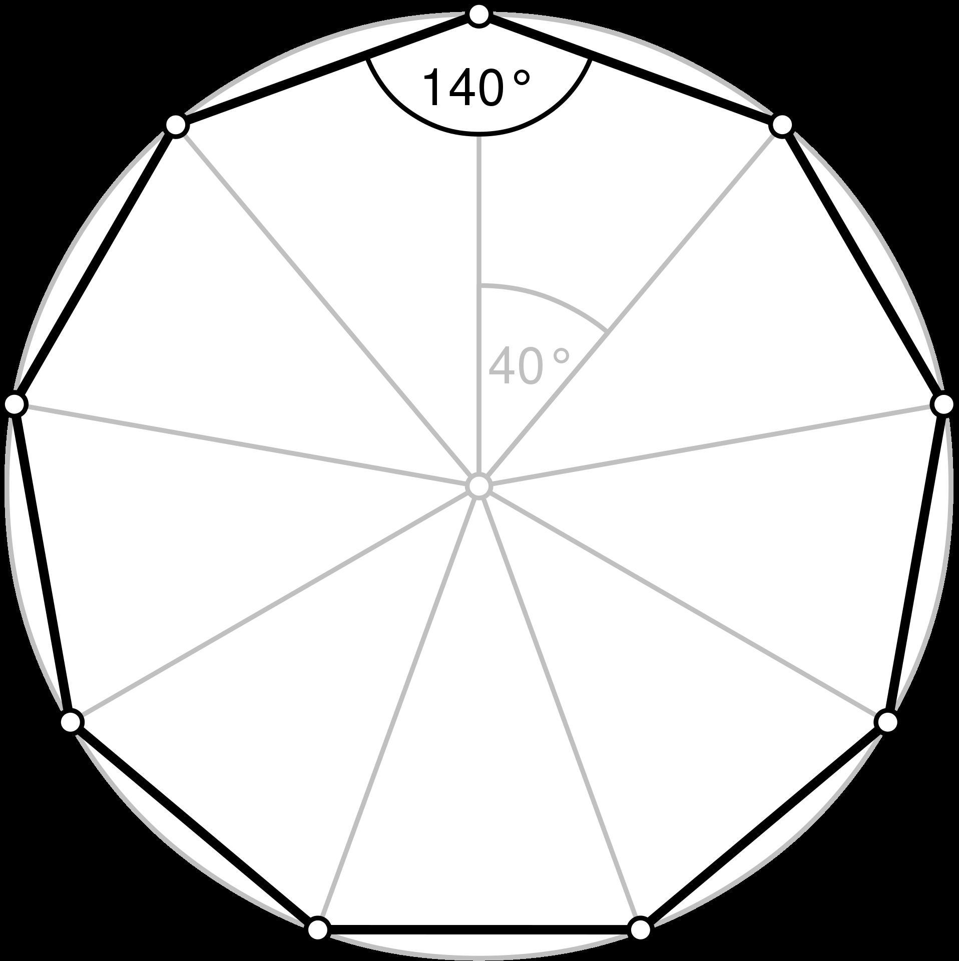 The figure can be divided into 9 congruent triangles. Each has a vertex at the center of the figure, and the other two vertices are each end of one side. The central angle (40°) is the supplement of the interior angle at each vertex of the nonagon (140°). Obviously, the central angles sum to 360° (one full circle), so each one has a measure that is 360° divided by the number of sides:
