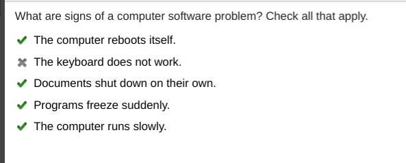 QUESTION:What are signs of a computer software problem? Check all that apply.