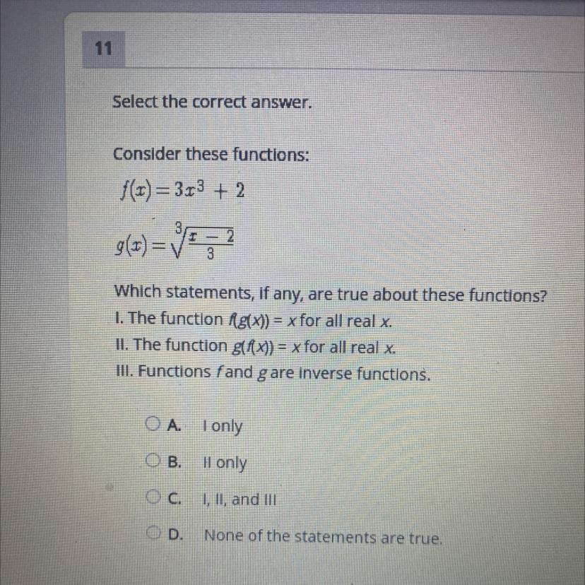 Since both f(g(x)) = x and g(f(x)) = x are true equations, this means that functions f(x) and g(x) are inverses of each other.