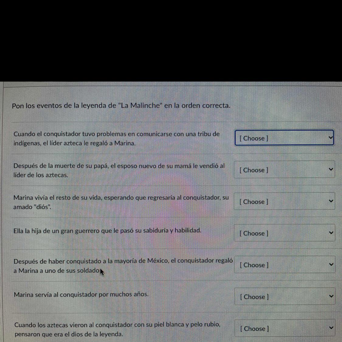 Pon los eventos de la leyenda de La Malinche en la orden correcta