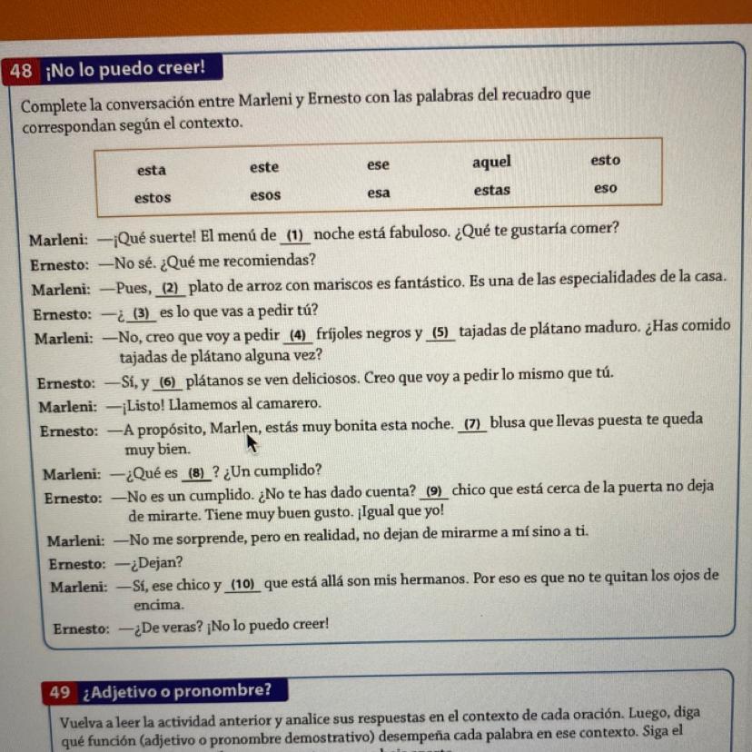 Mi madre esta buscando la llave de la habitacion= My mom is looking for theroom's key= 3. and 5. She's lost the key so she probably isn't happy and she is looking for the key to a room so they are probably in a hotel