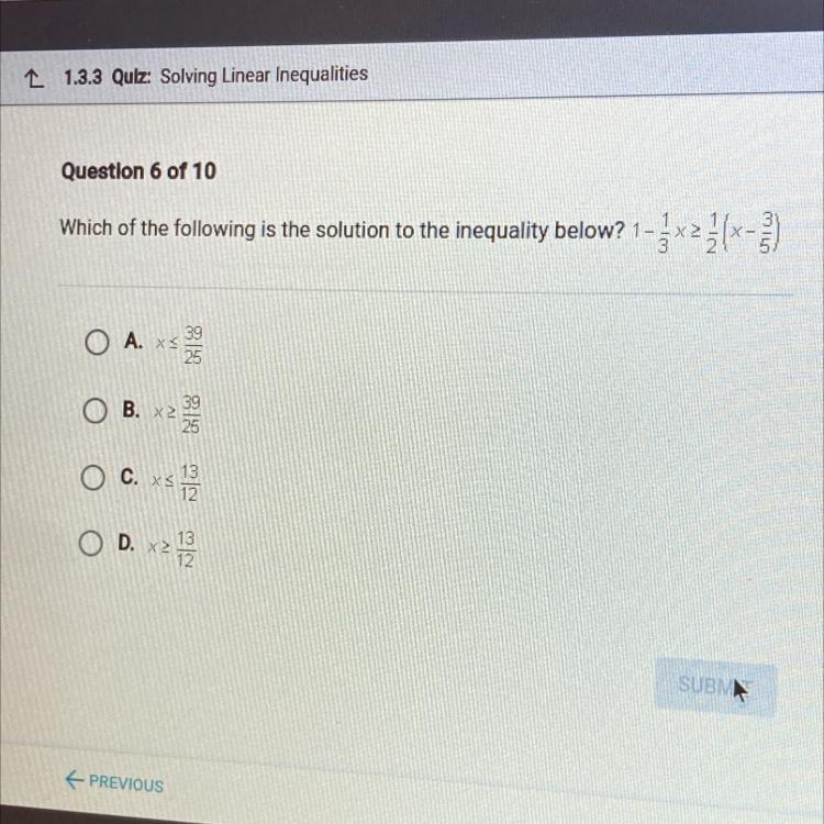 1 -  \frac{1}{3} x \geqslant  \frac{1}{2}  (x - \frac{3}{5} ) \\  \frac{3 - x}{3}  \geqslant  \frac{1}{2}(  \frac{5x - 3}{5} ) \\  \frac{3 - x}{3}  \geqslant  (  \frac{5x - 3}{10 } ) \\ \frac{3 - x}{3}  \times 3 \geqslant  (  \frac{5x - 3}{10 } ) \times 3 \\ 3 - x \geqslant ( \frac{5x - 3}{10} )3 \\ (3 - x) \times 10 \geqslant( \frac{5x - 3}{10} )3 \times 10 \\  (3 - x) \times 10 \geqslant(5x - 3)3  \\ 30 - 10x \geqslant 15x - 9 \\ 30 + 9 \geqslant 15x + 10x \\ 39 \geqslant25x \\   \frac{39}{25}  \geqslant x