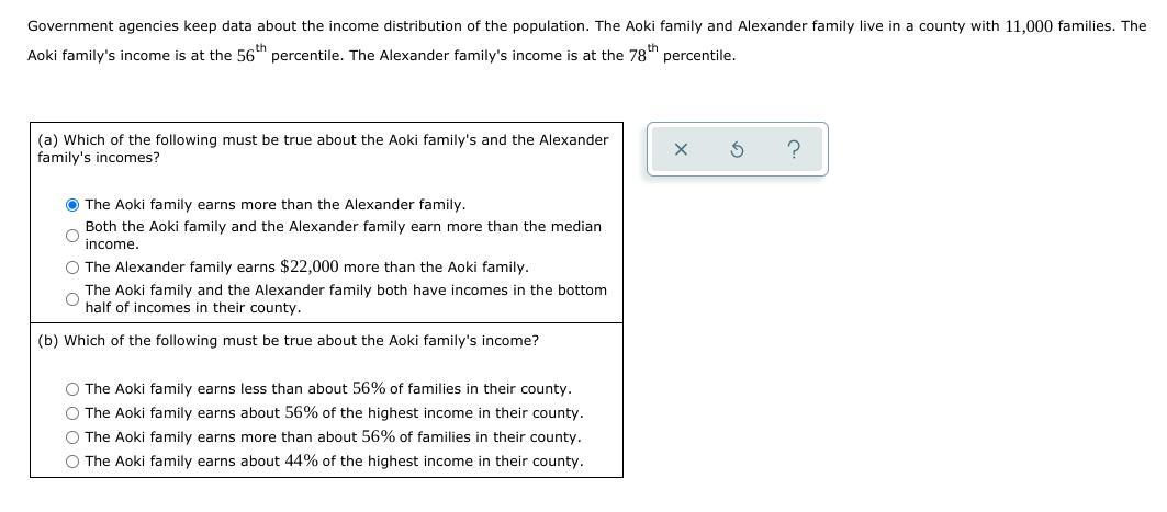 For the second question the answer is C, the Aoki family is at 56th percentile, which means its position is top 56%, not more or less