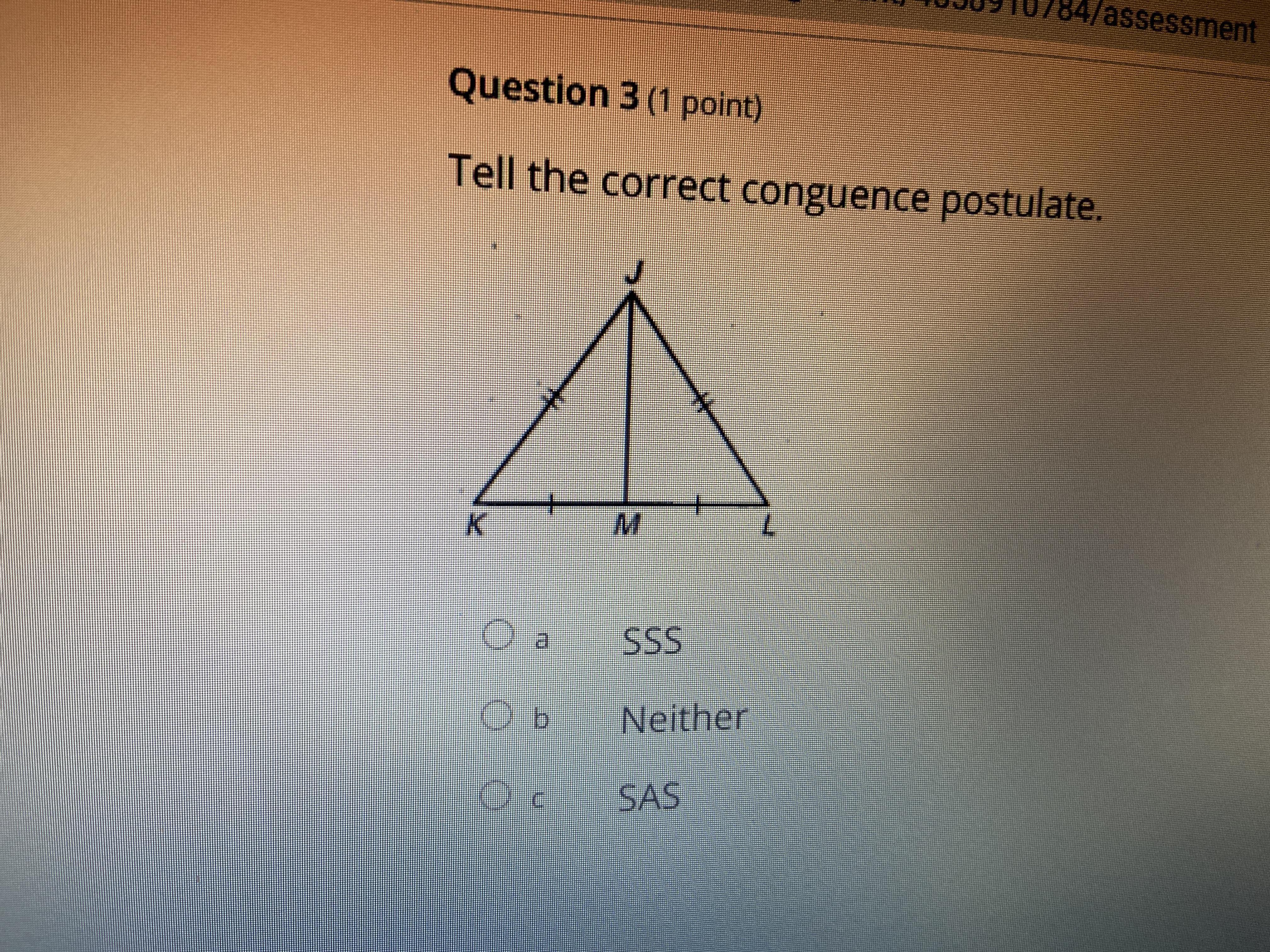 Because both triangles have the same side connected to, which means that that side is congruent to each other and because it tells us that JL and JK are congruent and KM and ML are congruent that means that its sss. Also, it is not giving us an angle to find the congruence so it has to be sss.