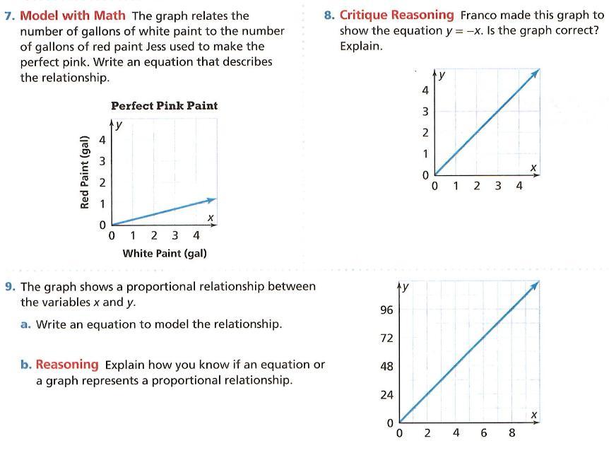 7. The graph is a proportional relationship because the line passes through the point of origin, (0, 0). To find the equation the proportional relationship the graph represents, we need to find the unit rate of red paint (y) to white paint (x). The unit rate will represent the constant of proportionality, k. Then substitute the value of k in y = kx.