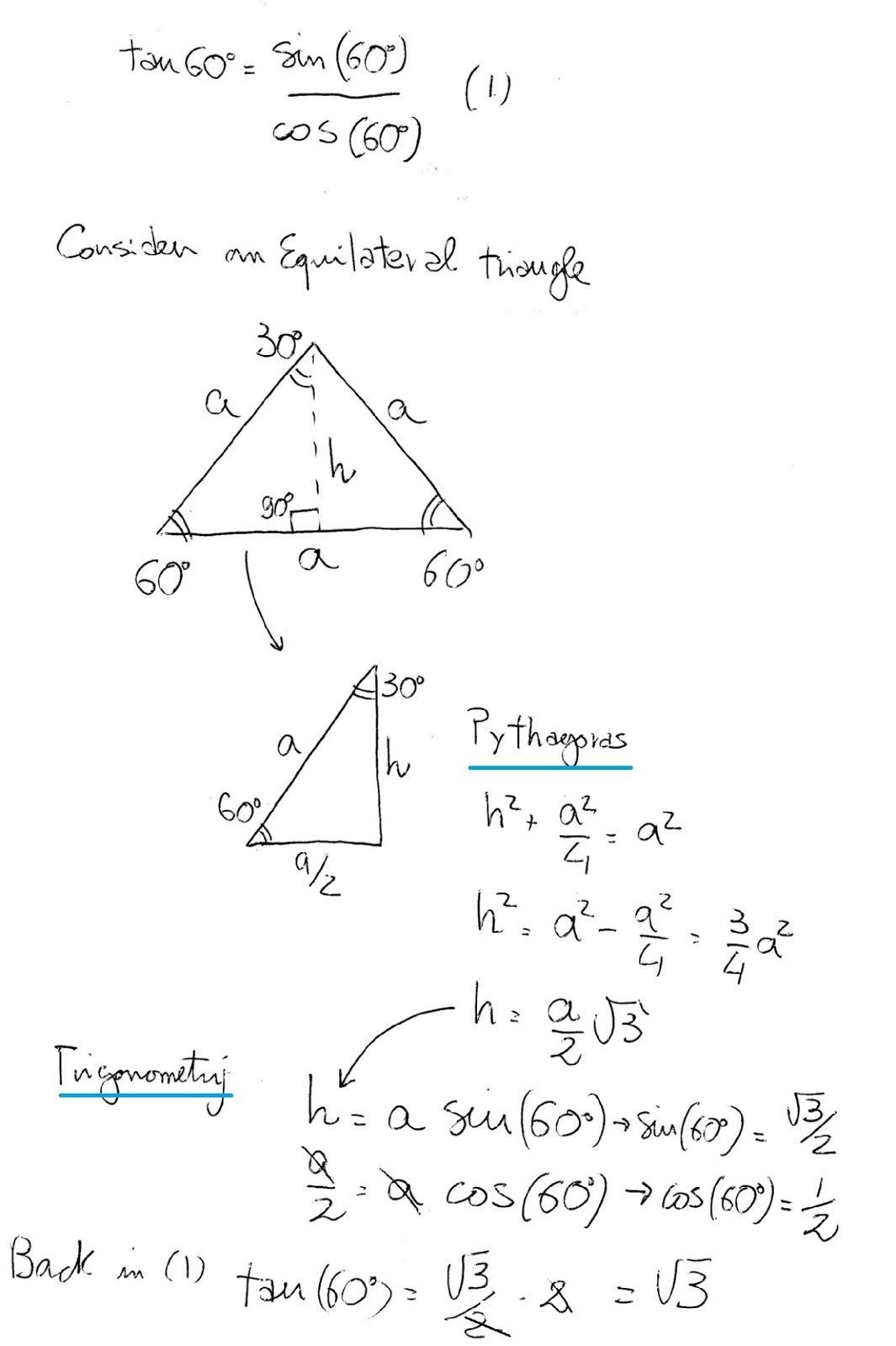 tan 60°=sm(60°)/cos(60°)