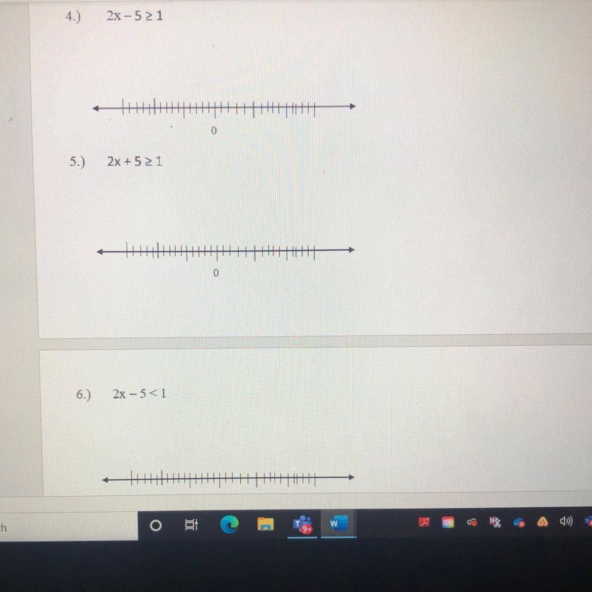 4. 2x-5>1 = 2x>6 x>3 ( since there is a line under the > you will make the dot filled in/ closed at the number 3 and point it towards the positives or higher numbers than three since x is bigger
