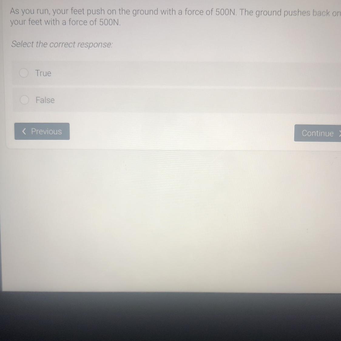 As you run , your feet push on the ground with a force 500N . The ground pushes back on your feet with a force of 500N . (Please