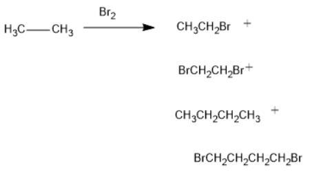 The reaction of ethane with bromine in presence of UV light forms mono substituted ethane at all primary and secondary carbons.