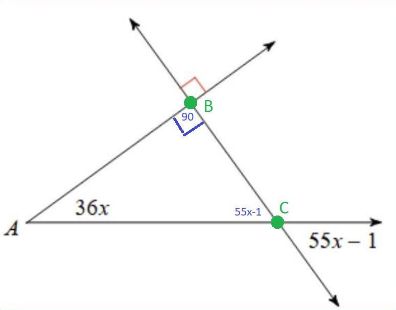 Angle C is 55x-1 degrees because it's vertical to the angle shown. Vertical angles are congruent.