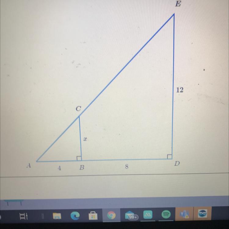 The shape is a right triangle so it has the same to sides. The one side has 4 so that means so does this side x, To support my answer 3x4=12 and that looks like about 3 of those side could fit into the one side 12.