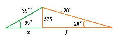 Notice as well that the information known for both right-angle triangles is one acute angle, and the side opposite to it. And what one needs to find is the side adjacent to this acute angle. Then, the function to use in both triangles, is the tangent: