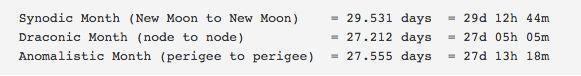 - Three of the moon's orbital periods repeat after one Saros period of 18 years 10.3 days, resulting in these coincidences. The three periods are as follows: