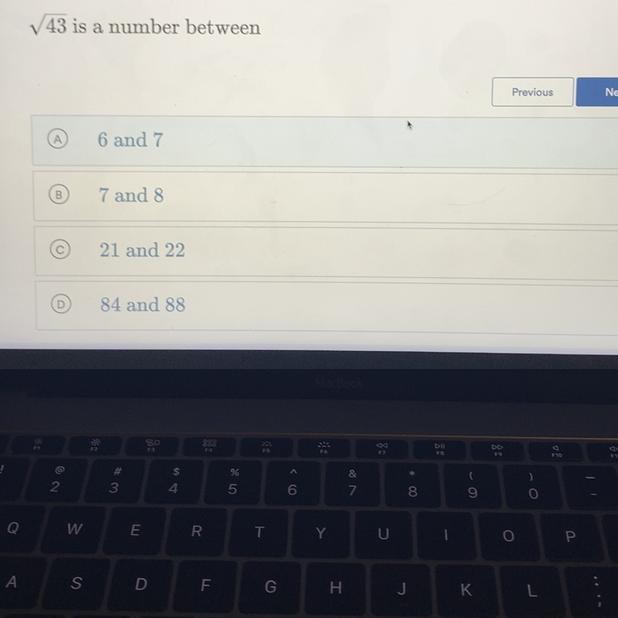the closest square numbers to 43 are 36=6^2 and 49=7^2 so sqrt43 is between 6 and 7