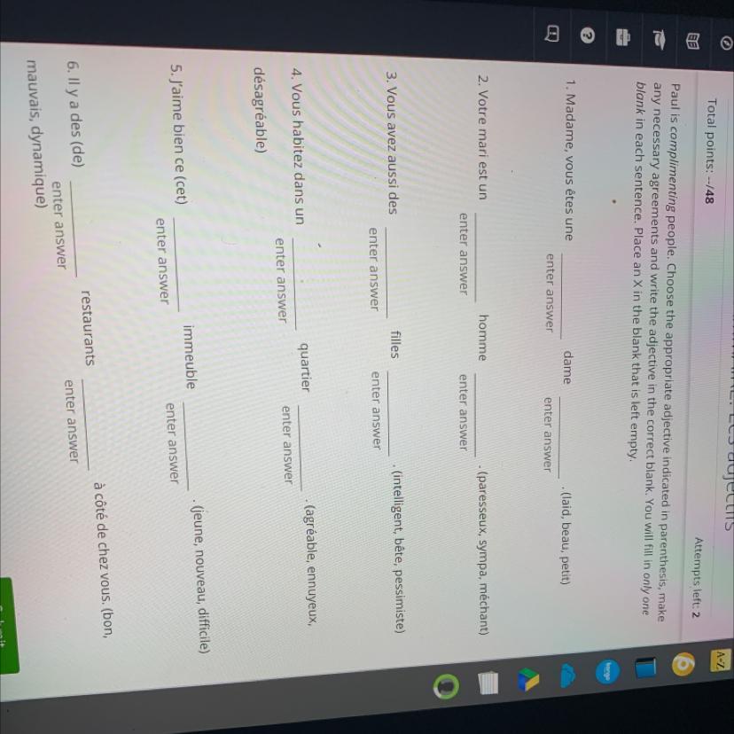 Paul is complimenting people. Choose the appropriate adjective indicated in paranthesis, make any necessary agreements and write the adjective in the correct blank. You will fill in only one blank in each sentence. Place an X  in the blank that is left empty.