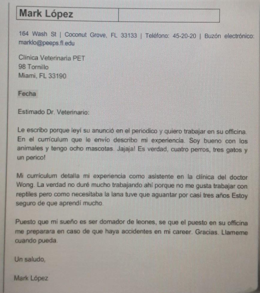 Estimado Dr. veterinario: Le escribo porque leí su anuncio en el periódico y quiero trabajar en su oficina. En el curriculum que le envío describo mi experiencia, soy bueno con los animales y tengo ocho mascotas ja, ja, ja, es verdad, ¡cuatro perros, tres gatos y un perico!