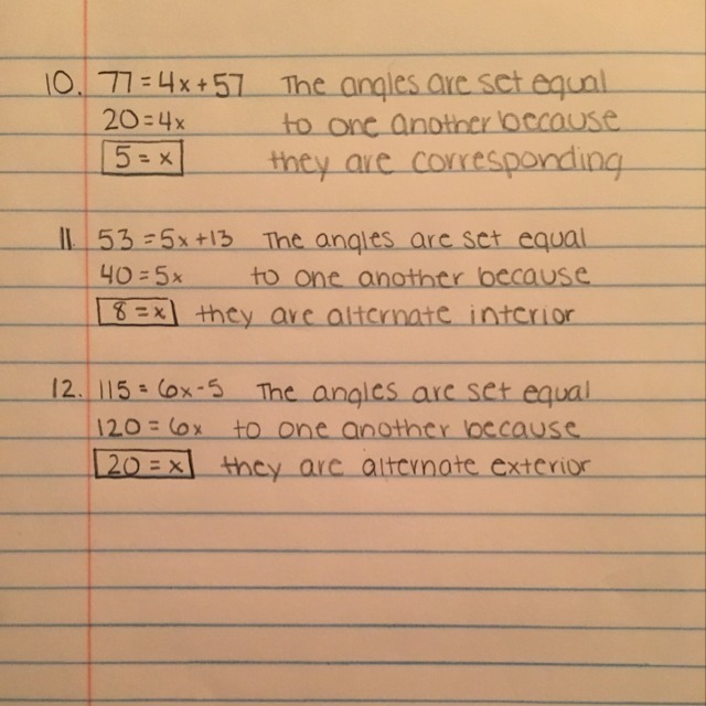 This should be the correct work for the questions. You set the angle measures equal to each other because they are corresponding, alternate interior, and alternate exterior.