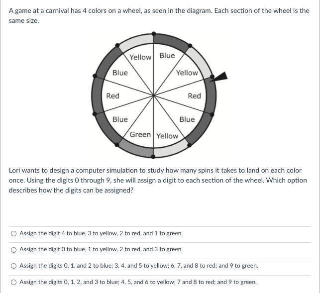 A game at a carnival has 4 colors on a wheel, as seen in the diagram. Each section of the wheel is the same size.