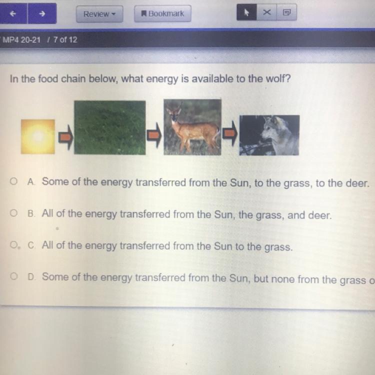 The sun will give energy to the grass, giving the ability to grow. The deer will then come along and eat the grass transferring some of that energy to the deer, giving it the energy to do it's daily activities, then the wolf will eat the deer, only transferring some of the energy to the wolf, because the deer had ahead used some of the energy and it came out as feces ect.