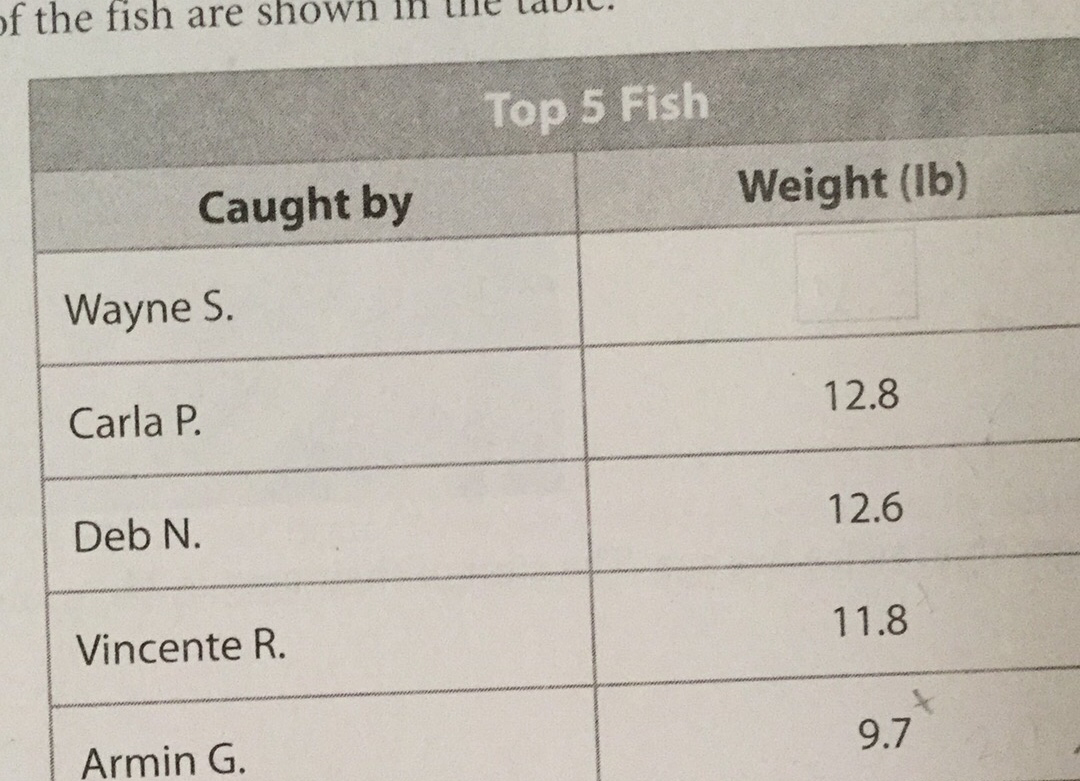 Total weight of 4 fish: 12.8 + 12.6 + 11.8 + 9.7 = 46.9 pounds