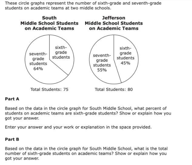 Part B= The total number of sixth graders on academic teams is 124. I got this by adding the 45% and the 36% to get 81% and then add the total number of students in both schools, which was 124. So then 81% of 155 is 124.