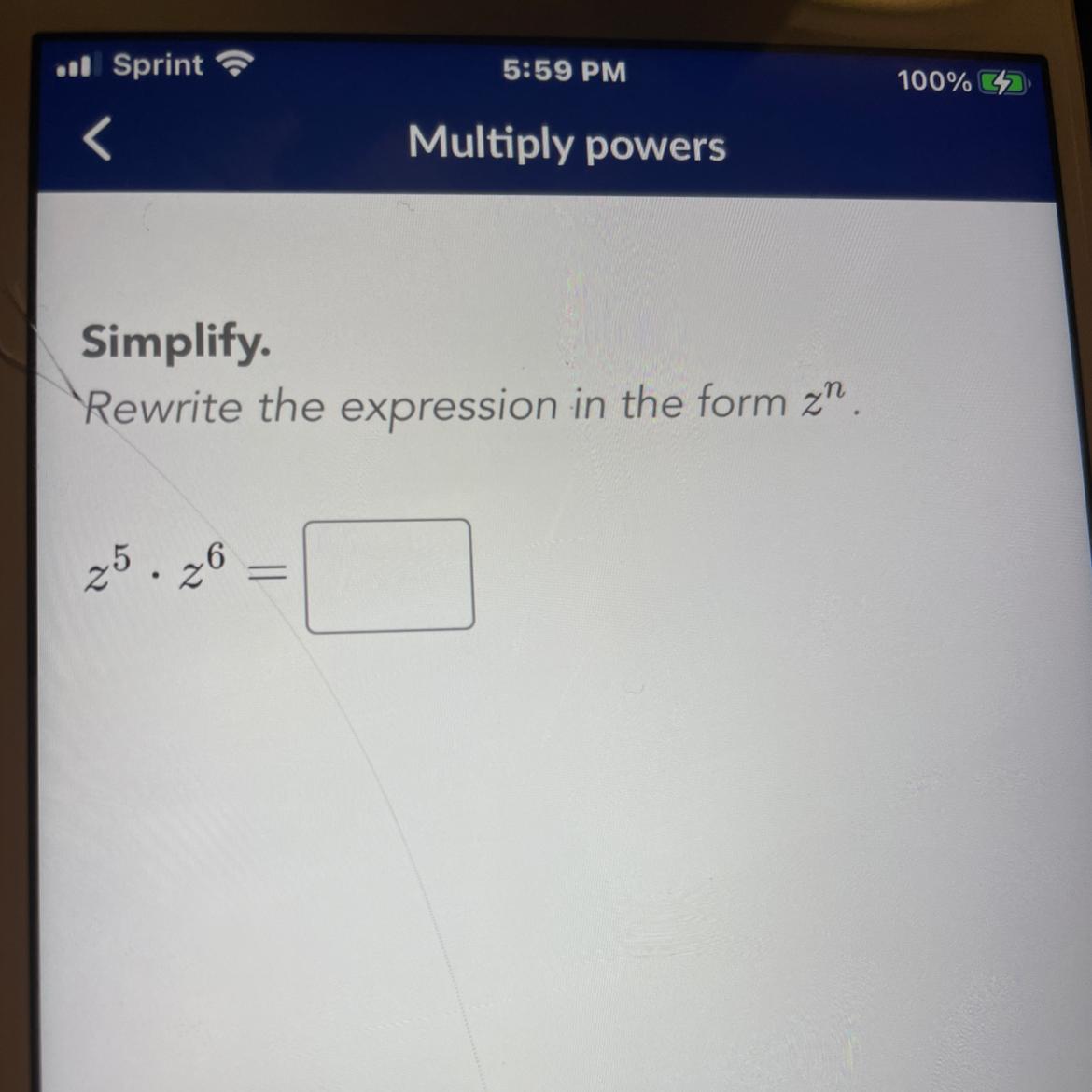 Rewrite the expression in the form z”. Z5 • Z6Simplify.