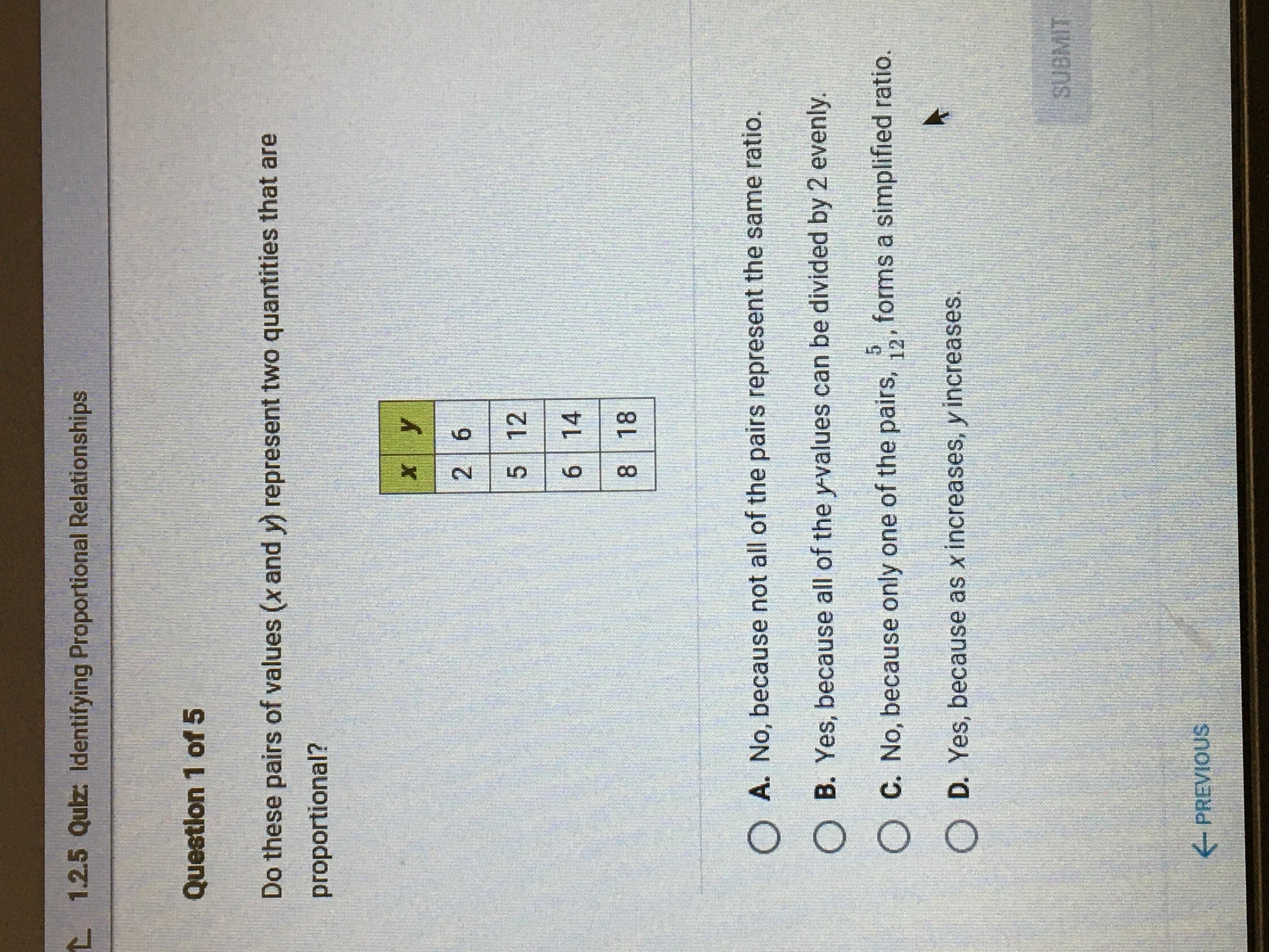 Do these pairs of values (x and y) represent two quantities that are proportional?