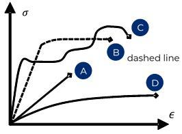 Consider the stress-strain diagram shown here. Assume all four material samples (A-D) were originally the same size and shape. I