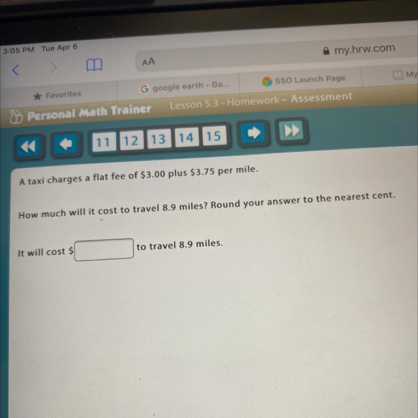 In order to get how much it will cost to travel 8.9 miles, you need to first set up a linear equation (in slope-intercept form, which is