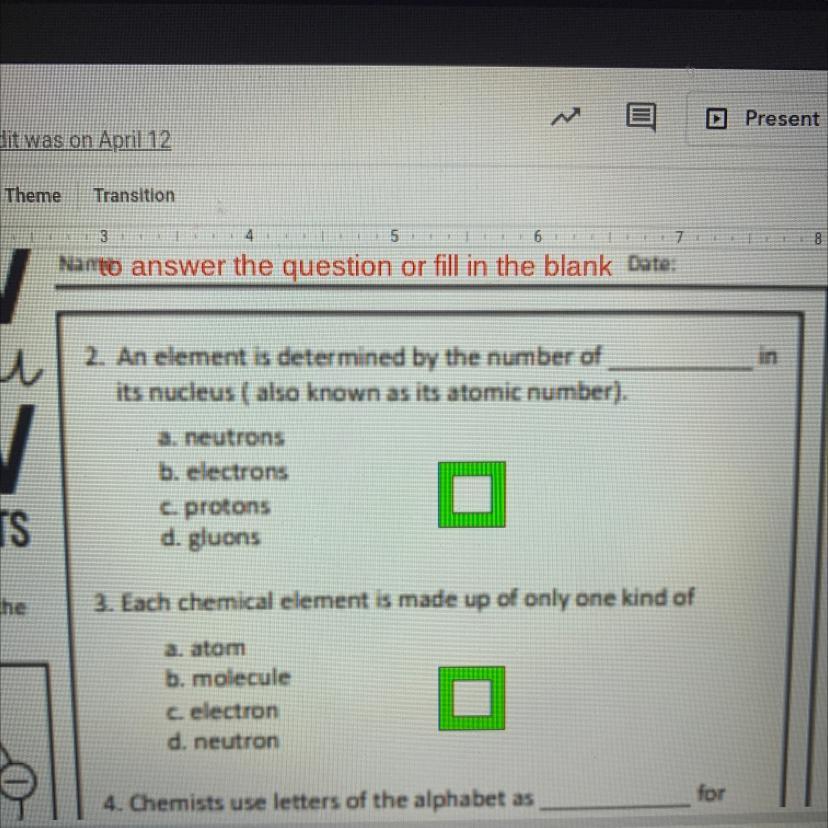 1. An Element is determined by the number of ________ and it’s nuclear ( Also known as atomic number).
