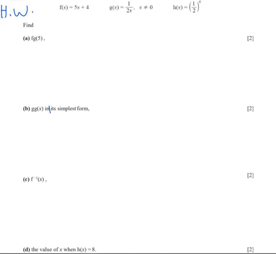 So the first one plug 5 in for x for both functions and then multiply the answers together. the second one multiply the two functions together and then simplify it the third one everytime you see an x make it a y and then make the f(x) into x and then solve for y so you basically undo everything from the one side to the other the fourth one means the equation =8 so what value of x would make the equation =8