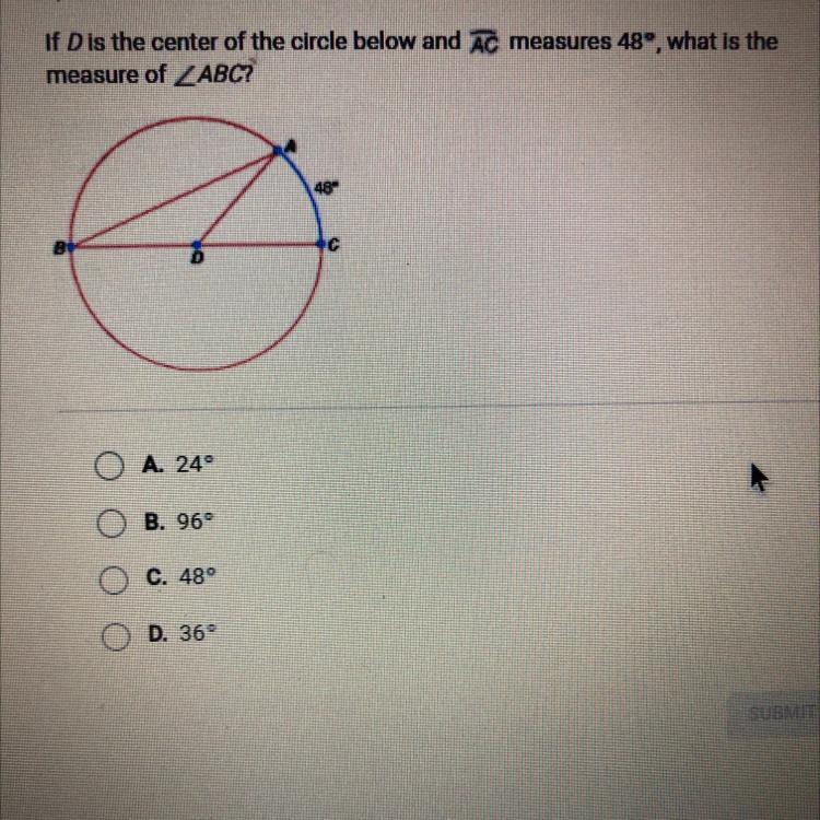If D is the center of the circle below and AC measures 48, what is the mesure of ABC
