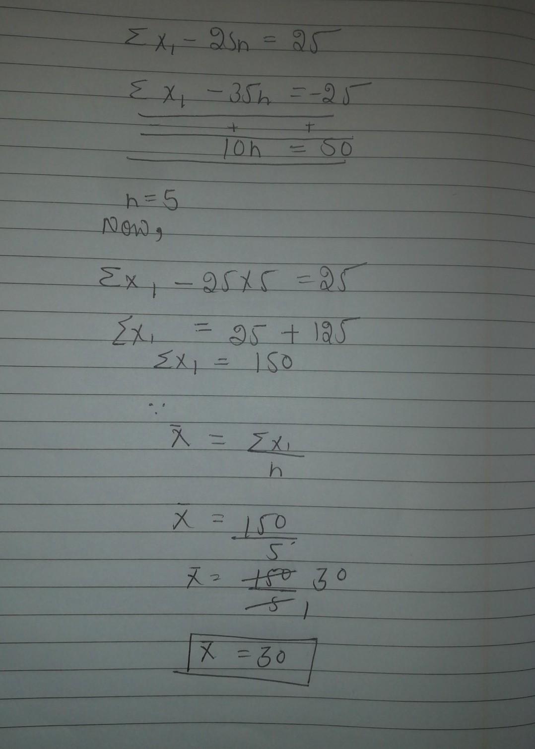 The sum of deviations of n observations about 25 is 25 and the sum of deviations of the same n observations about 35 is −25. The