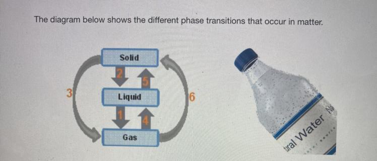 The phase transition that represent the the cooling of gaseous water to form liquid outside a bottle left outside which is a process known as is represented by the arrow 2
