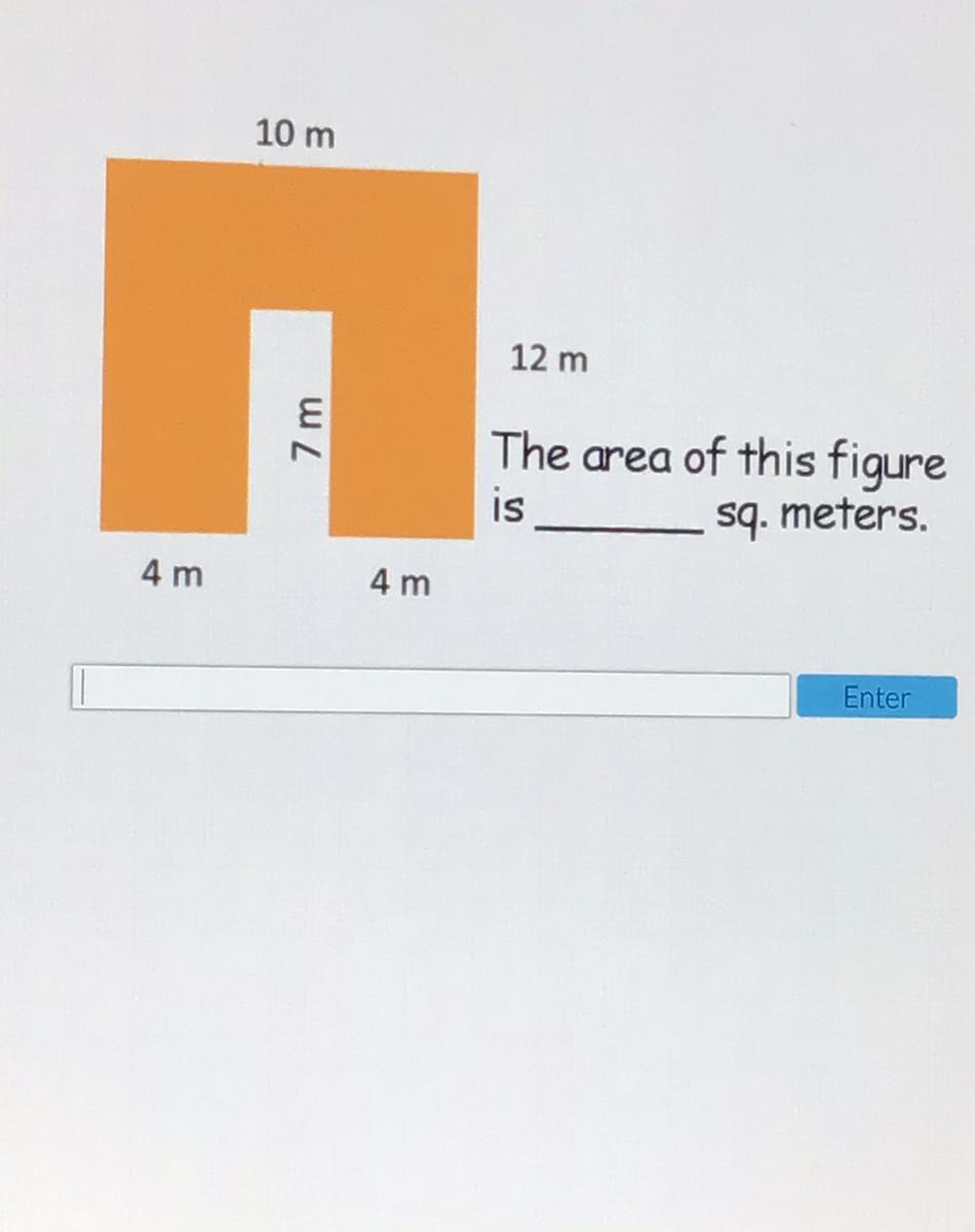 First, multiply the longest side. DO NOT do 10x12, do 10x5, since the side of that rectangle is 5, not 12 (12 is the whole shape). Then, do 4 by 7 twice, since the shorter sides have those dimensions. Then add that up to get...