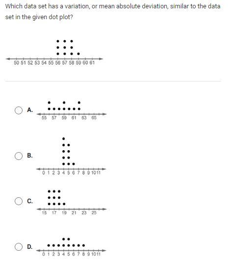 Which data set has a variation, or mean absolute deviation, similar to the data set in the given dot plot?