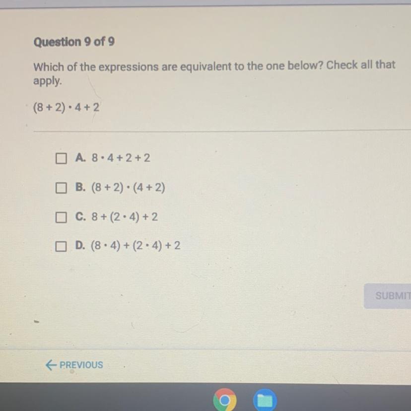 So for Choice A, we would go in order so starting with Parenthesis there is none, so we move on to Exponents. Since there is none we go to Multiplication. Now we Multiply 8 x 4 and get 32 and add 2 + 2. The sum doesn't add up to 42, so we know that the answer choice is wrong. If you keep doing this for all the answer choices, all of them would have a different number that wouldn't equal 42.