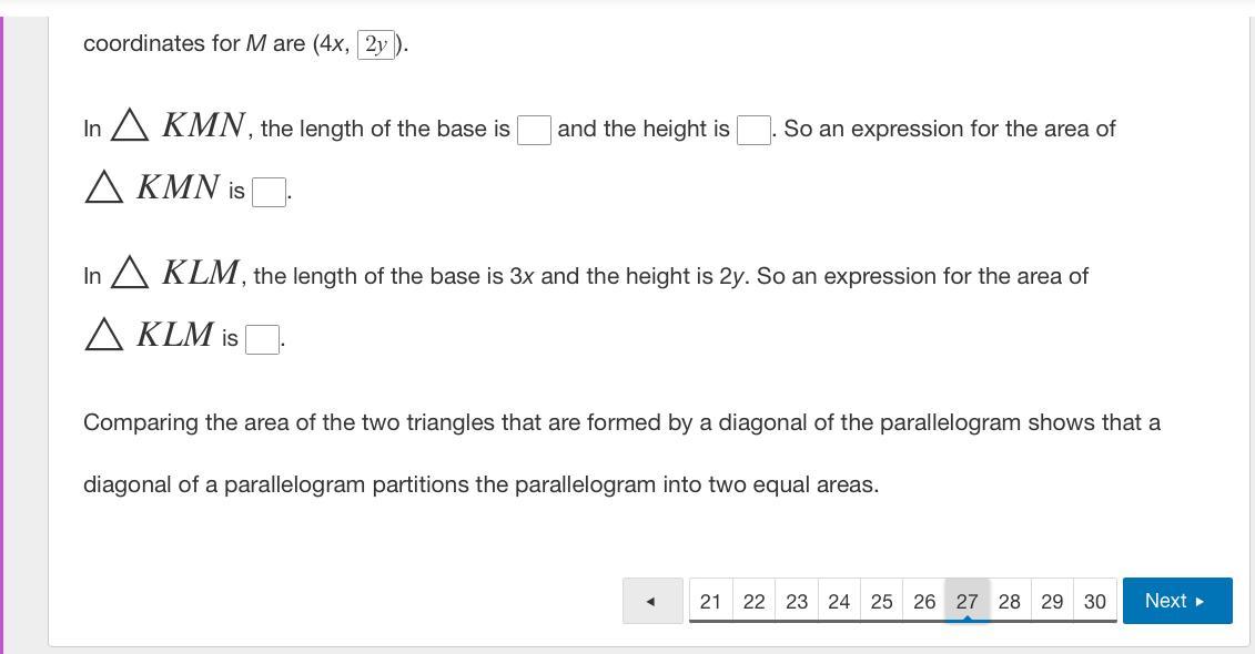 A parallelogram graphed on a coordinate plane. The vertices of rectangle are labeled as K L M and N. The vertex labeled as K lies on begin ordered pair 0 comma 0 end ordered pair. The vertex labeled as L lies on begin ordered pair x comma 2 y end ordered pair. The coordinate of vertex M is left blank. The vertex labeled as N lies on begin ordered pair 3 x comma 0 end ordered pair. A diagonal is drawn between points K and M.