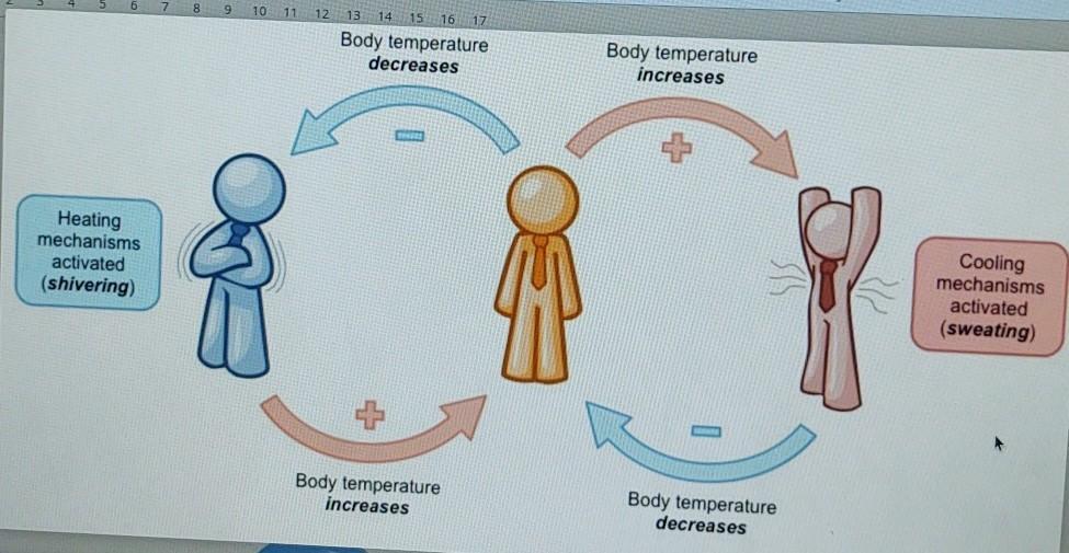 This picture is the mechanism for the THERMOREGULATION (control of the body temperature). It is the negative feedback, as you can see if the temperature is decreased that means the change occurs, so the process of shivering starts which is the movement of muscles which generates the heat resulting in the increase in temperature.