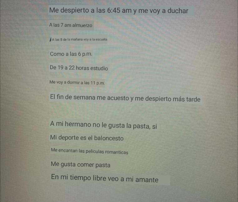 Me despierto a las 6:45 am y me voy a duchar. a las 7 am almuerzo. Como a las 6 p.m. de 19 a 22 horas estudio. Me voy a dormir a las 11 p.m. los fines de semana me acuesto y me despierto más tarde.