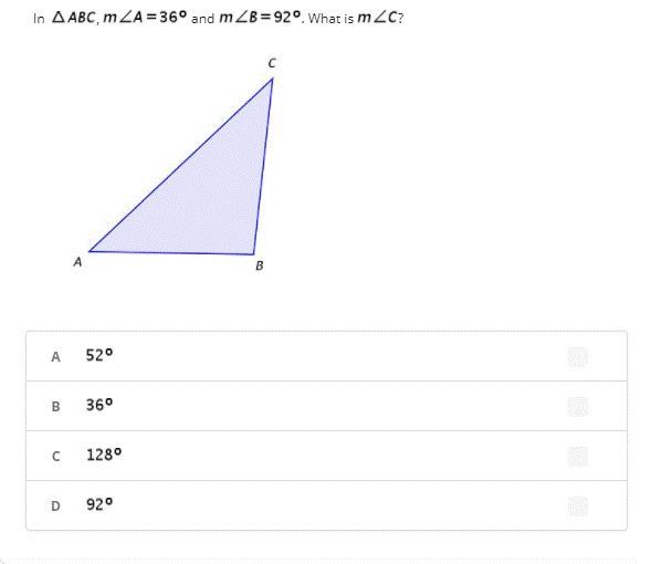 the angles on any triangle together equal 180 degrees. add up the two angles you know (36+92) and you get 128 degrees. then subtract that (128) from 180 and you get 52. 52 degrees is the missing angle.