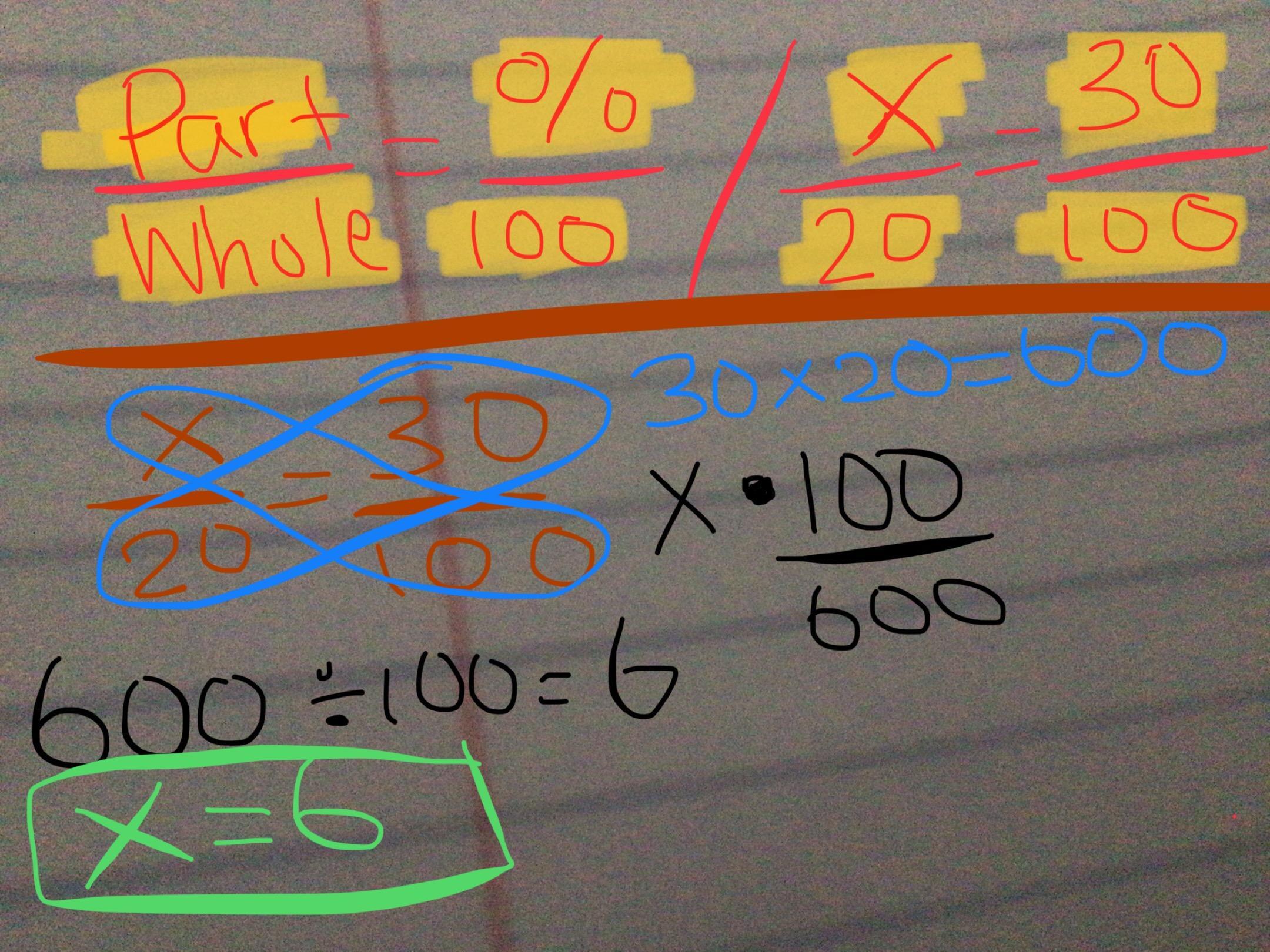 Now we would do cross multiplication. Like this 30 x 20 = 600. Since you can’t cross multiply X / 100 because we don’t have a number for the number is students that went in vacation as said before. Instead we do this we set up: X times 100. Now we will do 600 divided by 100 and that will equal us 6. So X = 6 students that went on summer vacation. Hope this helps the image below will help you what I’m talking about. I tired my best I can to explain it.