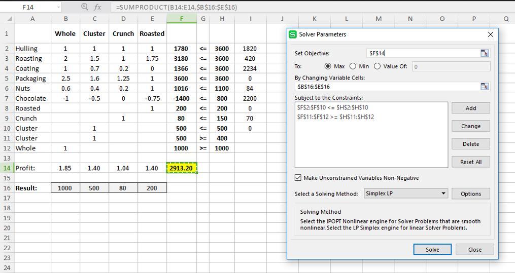Optimal solution: The company should produce the following quantities (in pounds) of the four varieties of nuts.