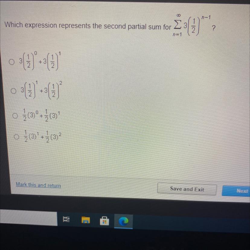 Which expression represents the second partial sum for Infinity Σ 3(1/2) HURRY PLEASE , I need help on a couple of them