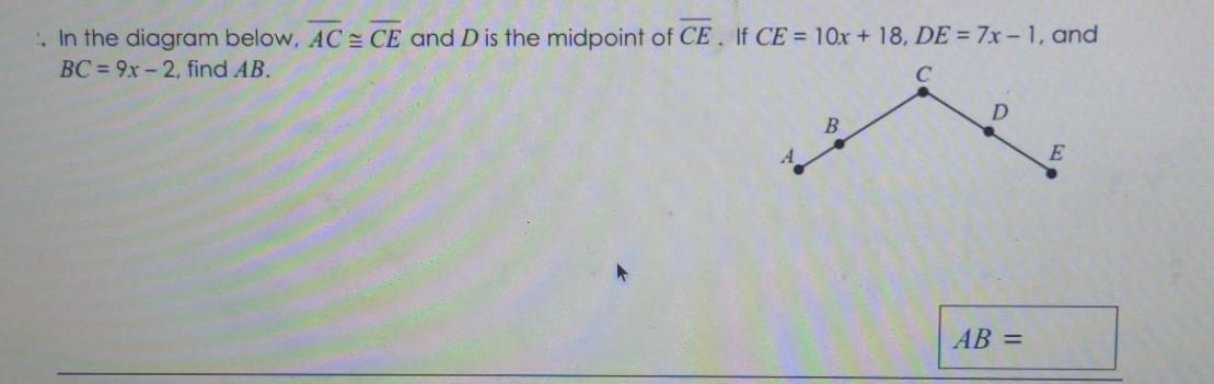 To solve for CE, we are given DE and CE. We know that DE is 1/2 of CE because D is the midpoint of CE. Therefore,