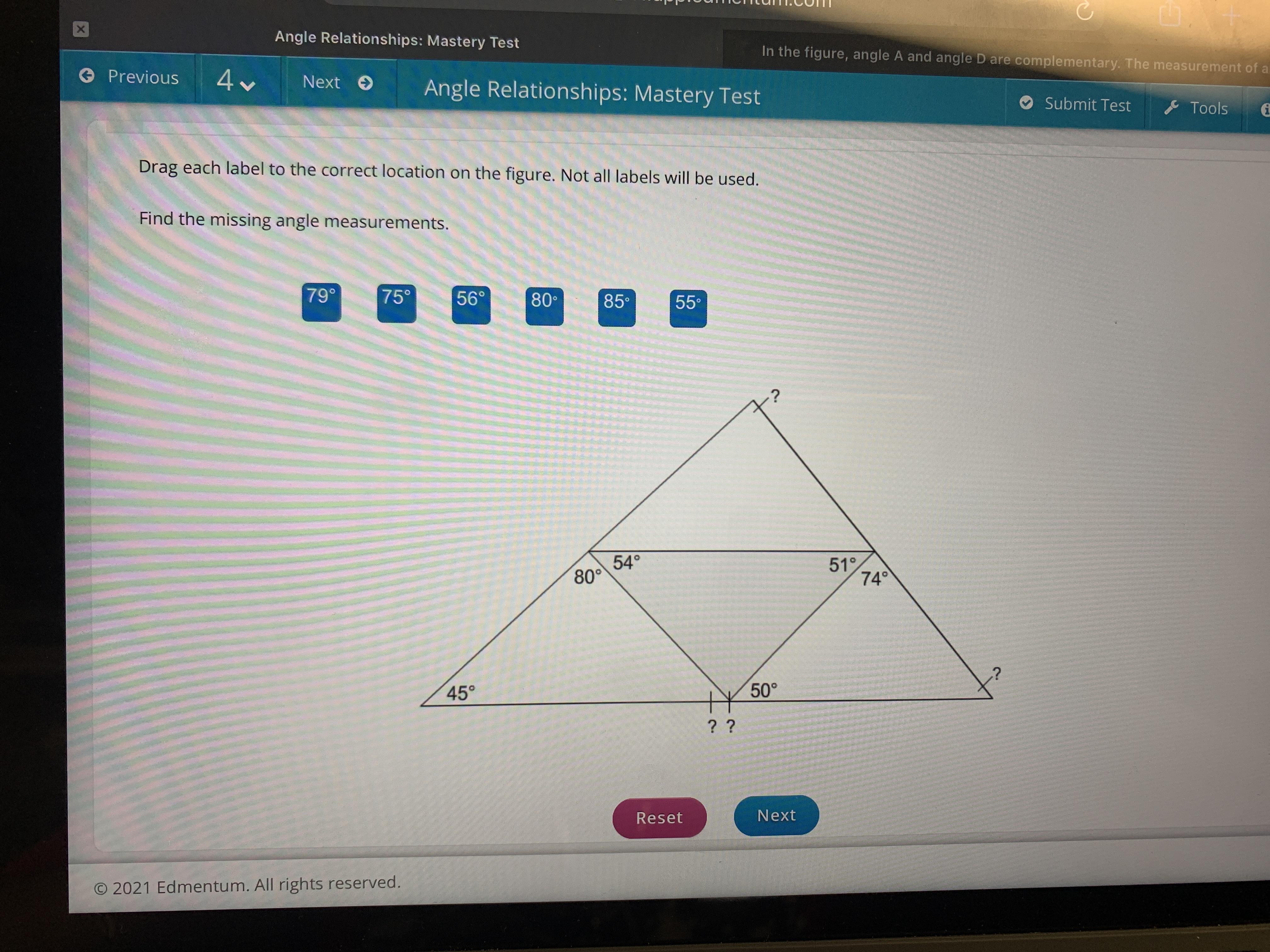 every angle in a triangle equals 180° and every straight line equals 180°. So you just take the angles given in each triangle and subtract from 180° to get the total of the 3rd angle.