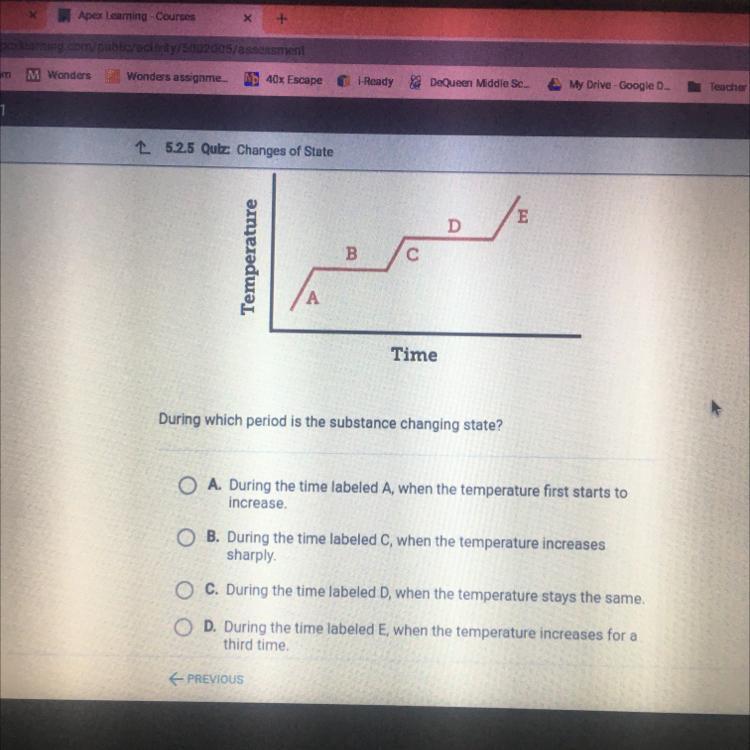 Change of state will occur as regions in which there is no change in temperature with time such as point D on the graph.