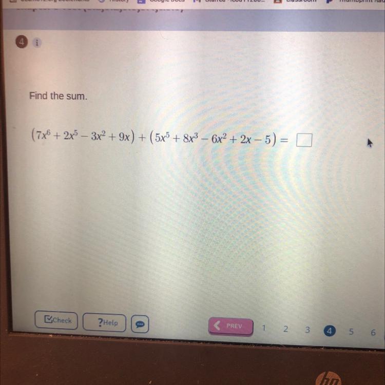 Find the sum. (7x® + 2x5 – 3x² + 9x) + (5x + 8x? – 6x² + 2x – 5) =