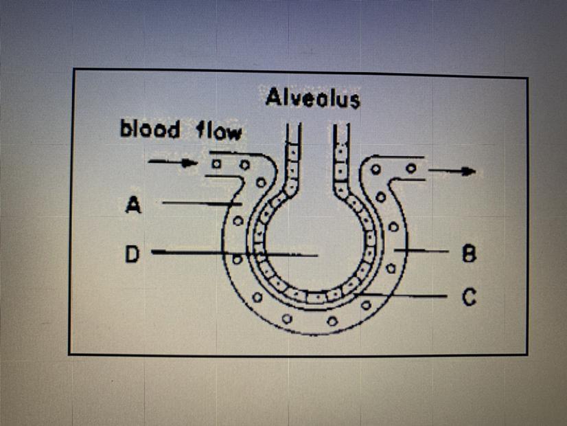 <em>Just before the blood flow in the capillary comes into contact with the alveolus (marked with A in the diagram) the blood has a </em><em>high content of CO₂, and a low content of O₂</em><em>. Once it comes into contact with the alveolus, CO₂ will be released for removal and O₂ will enter, which is the result of alveolus-capillary gas exchange.</em>