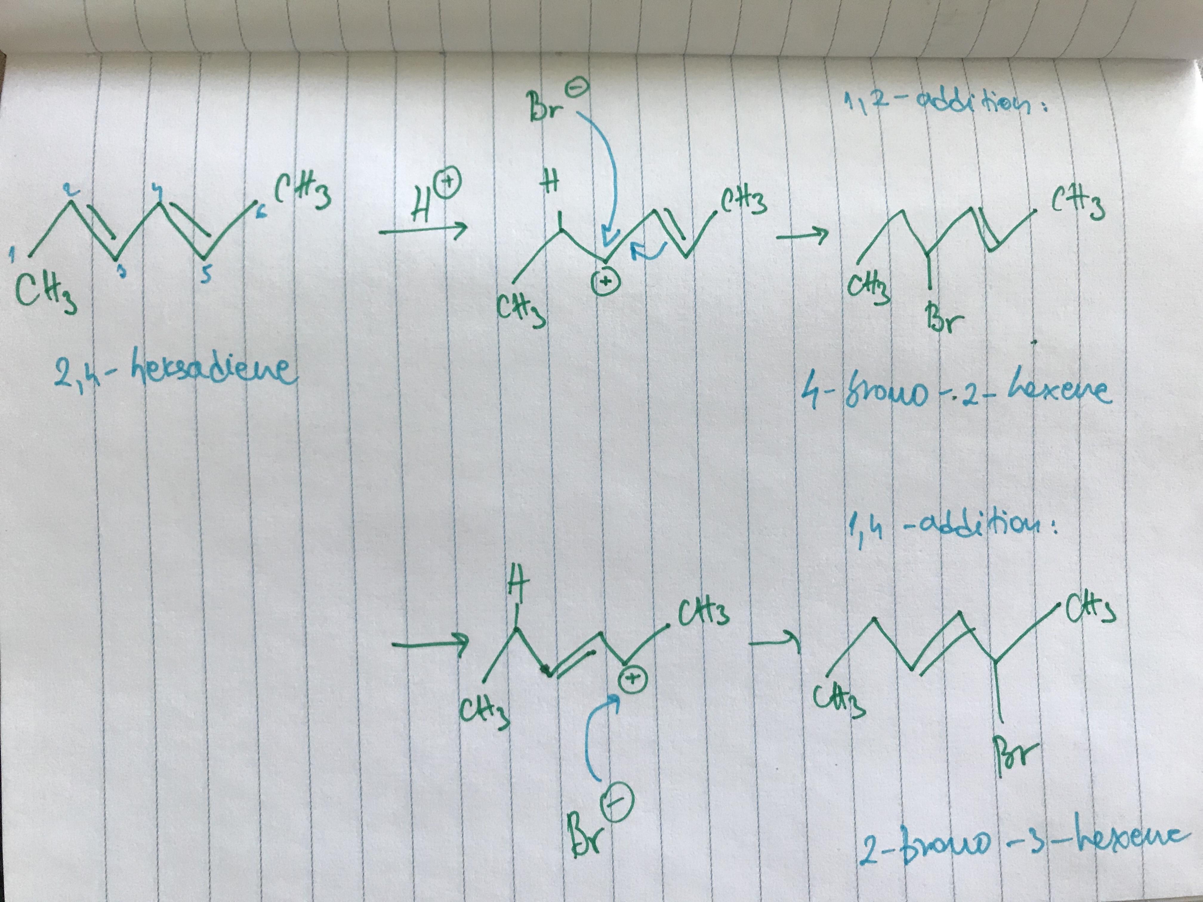 to the carbon, one double bond disapears leaveing nearby CH positively charged. This intermediate is a resonance hybrid of two possible structures. Reaction of bromide at one of the carbons gives the 1,2-addition product and at the other carbon gives 1,4-addition product.